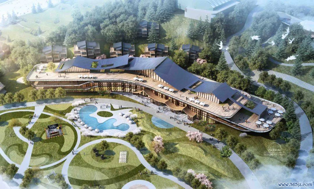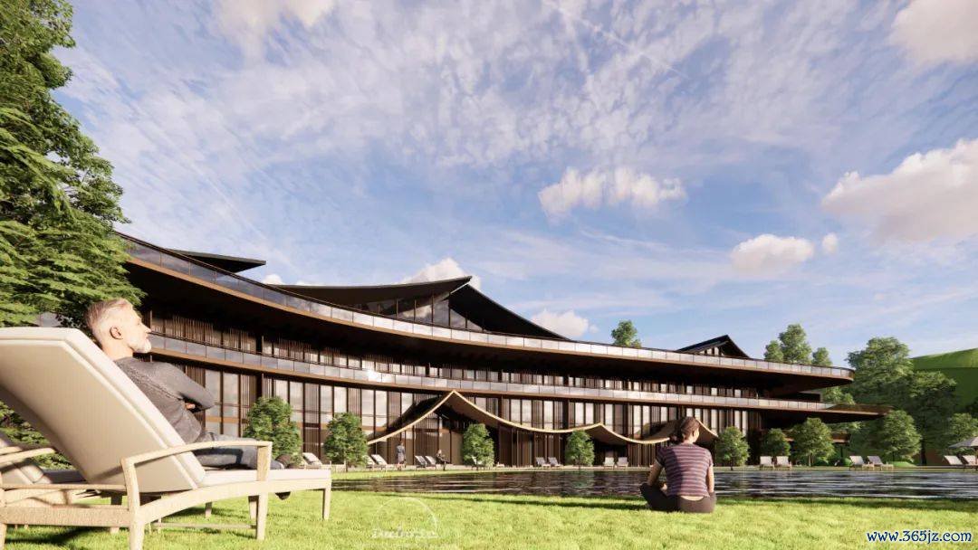 从俯瞰图中不错看到,开通谷的举座布局衰败有致,与周围的山体井水不犯河水。其中,开通温泉康养酒店的绸缪尤为引东说念主夺目。酒店主体树立弃取了屋面叠峦高涨的格式,与山体天空线交相衬映,营造出一种息争而壮好意思的视觉恶果。立面则讹诈了木格栅、透光玻璃及局部竹钢等材料,使得光影幻化间更添几分儒风雅韵。