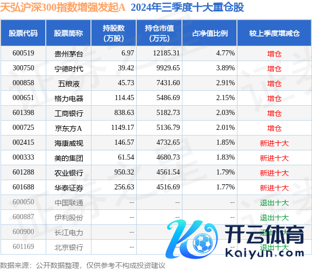 天弘沪深300指数增强发起A为指数型-股票基金,左证最新一期基金季报透露,该基金财富竖立:股票占净值比95.29%,债券占净值比0.66%,现款占净值比4.56%。基金十大重仓股如下:
