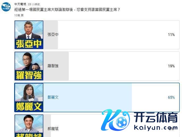 国民党党主席改组大狡辩结束,由台湾中天新闻主理,邀请这次国民党参选东说念主罗智强、郑丽文、张亚中进行现场狡辩,现场还竖立了发问东说念主蔡正元、前台北县长周锡伟。有申论,有彼此发问,还有现场发问,所有这个词现场你来我往,唇枪舌剑,办的还算圆满,惟一缺憾的是热点候选东说念主郝龙斌莫得进入,他给出的意义是时分仓促,莫得准备好,但他示意会进入下一场狡辩。
