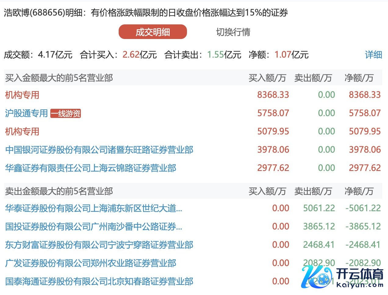 浩欧博本日20cm涨停,2家机构专用席位净买入1.34亿浩欧博本日20cm涨停,2家机构专用席位净买入1.34亿